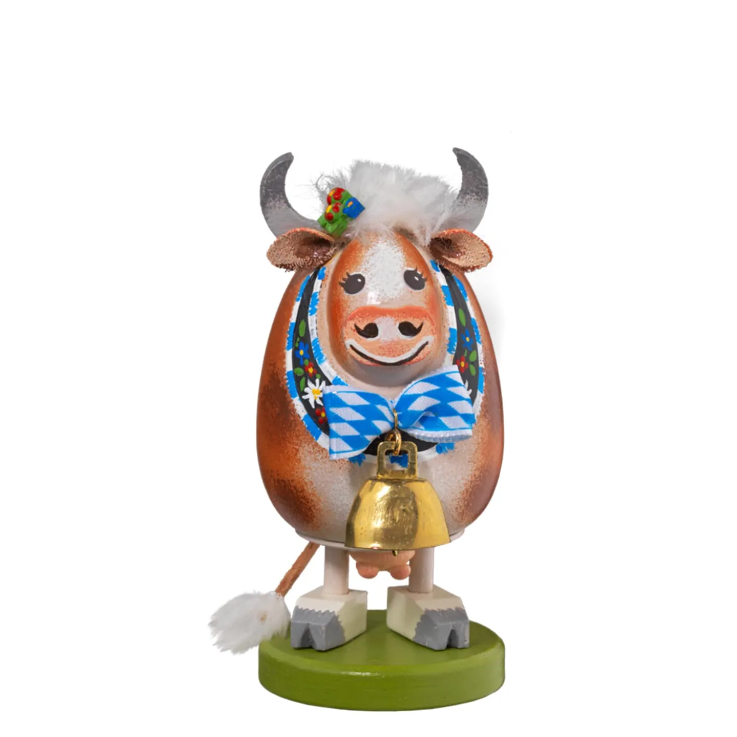 Unsere Hubsch Zurechtgemachte Und Freundliche Bayerische Kuh Mit Groser Kuhglocke Um Den Hals Schaut Mit Grosen, Freundlichen Augen In Die Welt. In Ihren Wuscheligen Haaren Tragt Sie Kleine Wiesenblumen Von Ihrer Weide. Selbst Das Band Der Kuhglocke Ist Aufwandig Mit Bluten Und Einer Blau-Weisen Schleife Verziert.
