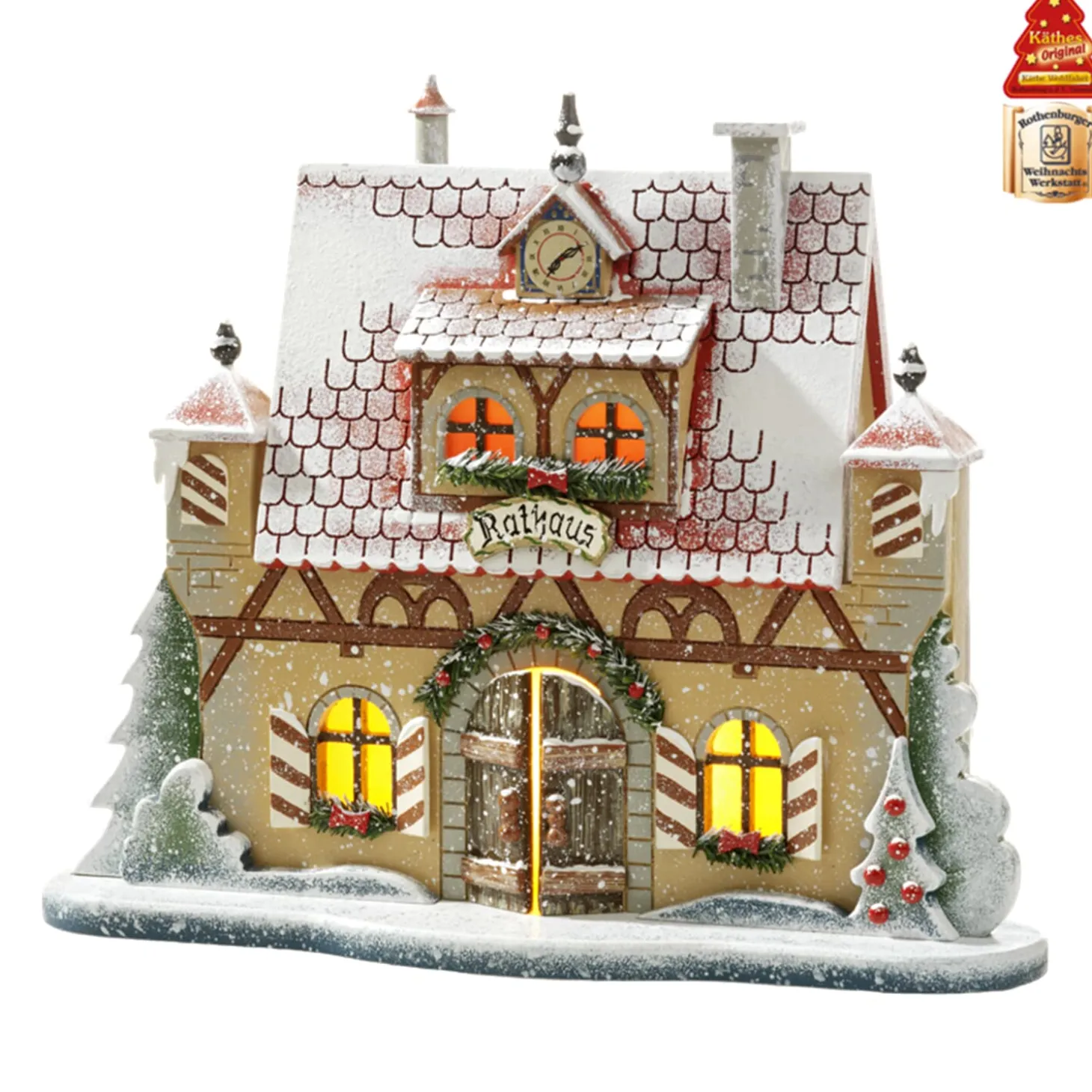 Die Imposante Rathaus Wird Sich In Ihr Weihnachtliches Winterdorf Wunderbar Einfugen Und Als Leuchtende Kulisse Die Szenerie Auf Dem Marktplatz Bereichern. Aus Den Fenstern Der Schneebedeckten Fachwerkhauses Mit Zwei Turmchen Stromt Warmes Licht Auf Die Die Winterliche Strase Hinaus. Festlich Sind Die Fenster Und Der Eingang Mit Tannengrun Dekoriert. Auf Der Rathausuhr Wurde Ein Kleiner Tannenbaum Platziert.