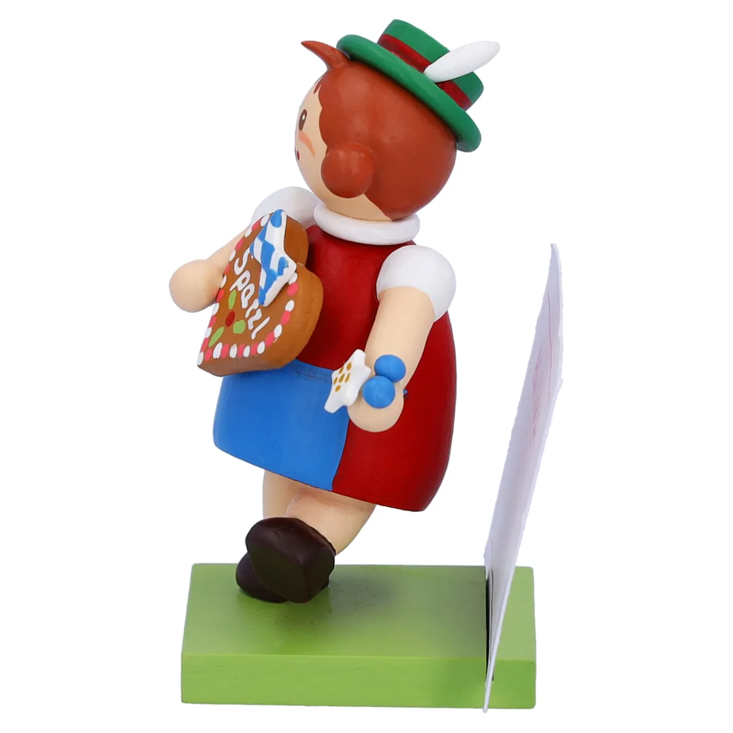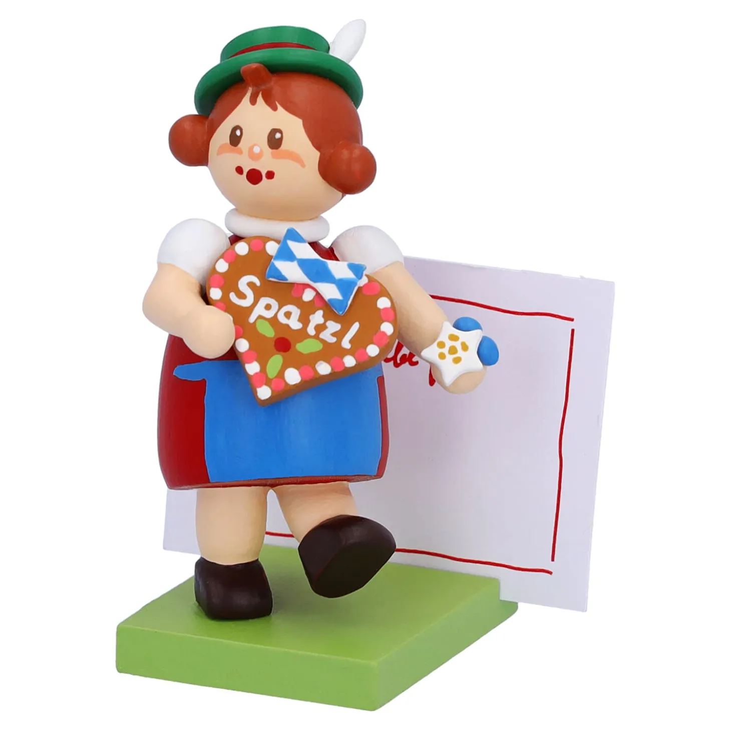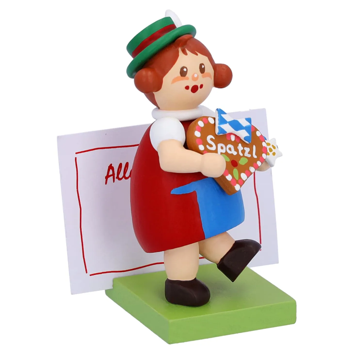 Das Niedliche Madchen Aus Bayern In Dirndl Halt Ein Groses Lebkuchenherz In Handen. Darauf Ist Mit Zuckerschrift „Spatzl“ Geschrieben. Einem Typischen Bayerischen Kosenamen Fur Einen Geliebten Menschen. Auf Dem Sockel Konnen Sie Ihre Personliche Botschaft Platzieren. Die Passenden Zettel Bringt Die Hubsche Bayerin Gleich Mit.
