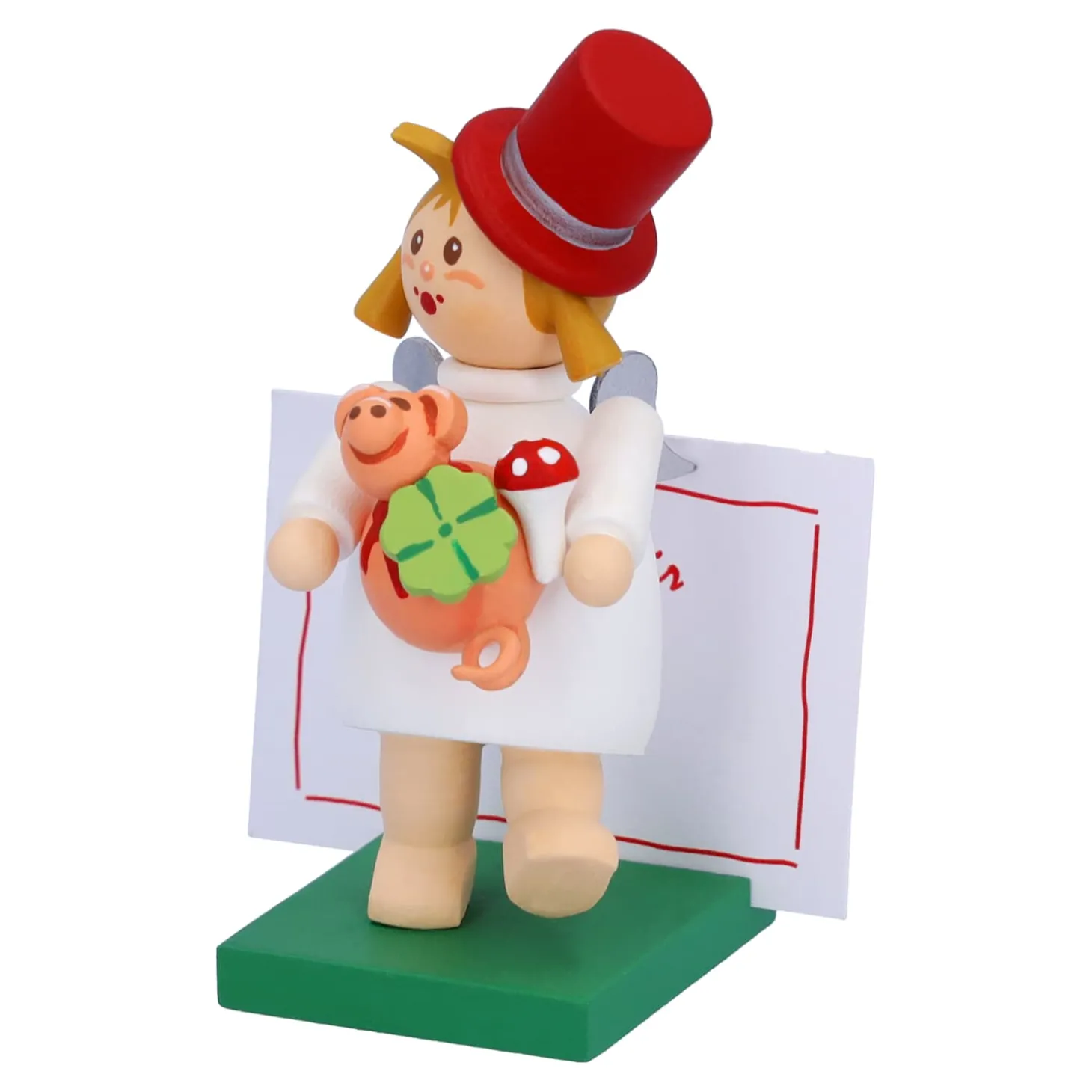 Mit Diesem Kleinen Glucksbringer Kann Nichts Mehr Schief Gehen. Das Kleine Engelchen Hat Zur Unterstutzung Ein Rosa Glucksschweinchen Und Einen Glucksklee Dabei. Der Schornsteinfeger Hat Dem Engelchen, Fur Die Extraportion Gluck, Seinen Zylinder Geliehen. Voller Stolz Tragt Der Kleine Glucksbringer Den Hut Auf Seinem Kopf.