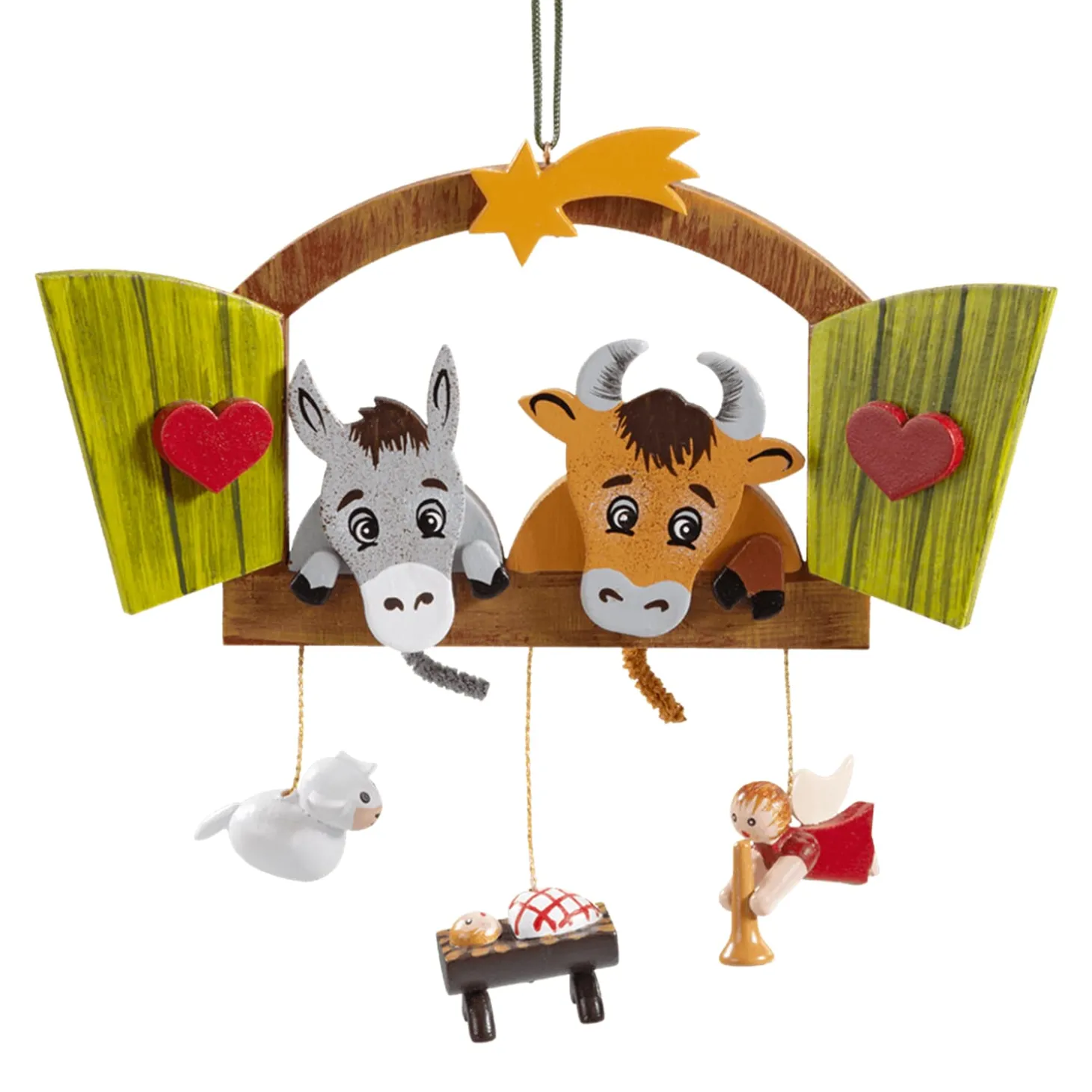 Zu Weihnachten Durfen Sie In Keiner Krippe Fehlen: Ochs Und Esel Neben Dem Jesuskind. Die Drolligen Tiere Betrachten Sinnbildlich Das Neugeborene Jesuskind Durch Das Fenster Des Stalles. An Dem Krippenfenster Baumeln Noch Ein Weises Schafchen Und Der Verkundigungsengel. Diese Liebevoll Und Etwas Verspielt Gestaltete Szene Der Weihnachtsgeschichte Wird Sie Bezaubern!