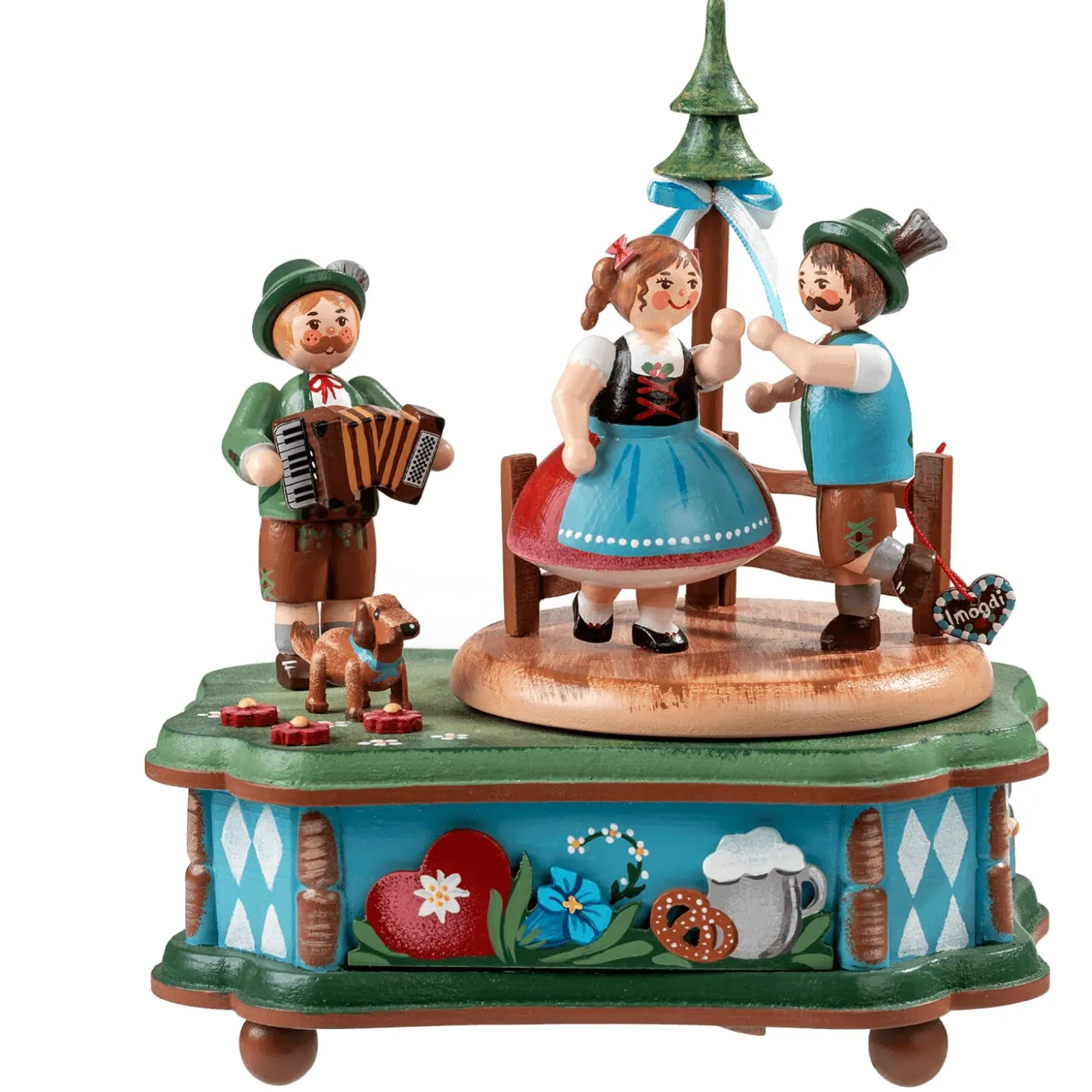 In Bayern Wird Tradition Und Brauchtum Noch Grosgeschrieben. Das Spiegelt Sich Auch In Der Traditionellen Kleidung Wider, Die Zu Besonderen Anlassen Und Festen Getragen Wird. Das Hubsche Trachtenpaar Tragt Hier Naturlich Dirndl Und Lederhosen Und Tanzt Freudig Auf Der Drehenden Buhne. Musikalisch Begleitet Werden Die Bayerischen Tanzer Von Einem Akkordeonspieler Und Ein Niedlicher Hund Beobachtet Den Heiteren Trubel! Die Einzigartige Musikdose Ein Schones Erinnerungsstuck An Eine Reise Nach Bayern, Aber Naturlich Auch Eine Freudvolle Dekoration Im Zuhause Echter Bayern-Fans!