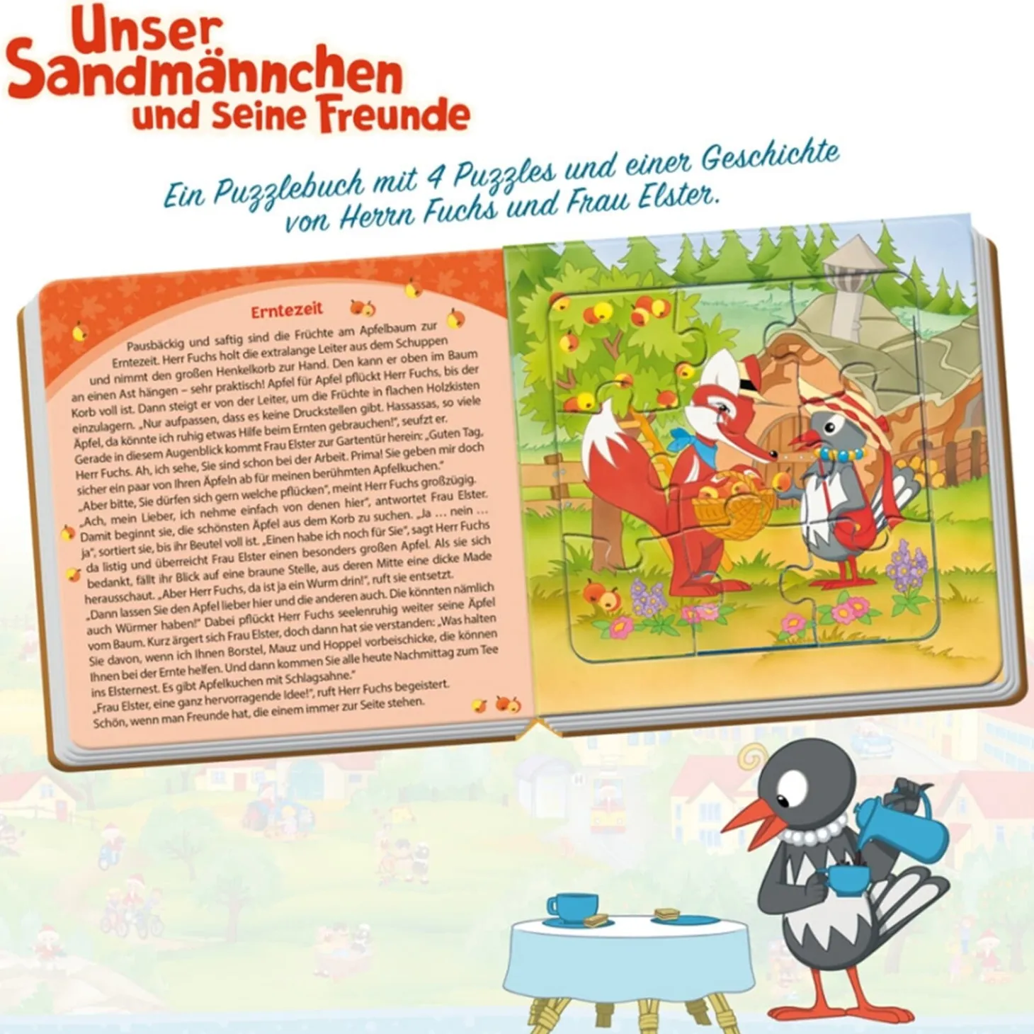 Farbenfrohes Puzzlebuch Mit Herrn Fuchs Und Frau Elster Aus Der Bekannten Tv-Serie „Unser Sandmännchen Und Seine Freunde“.