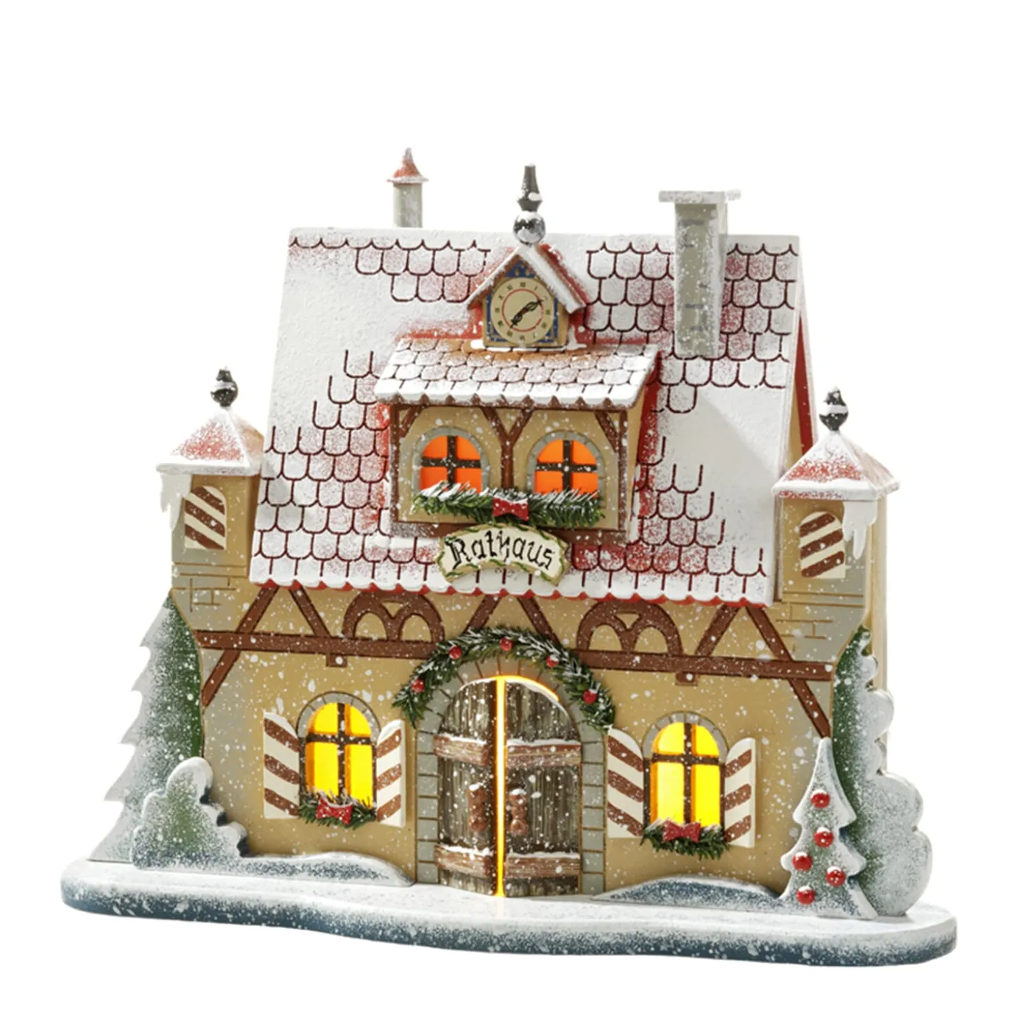 Die Imposante Rathaus Wird Sich In Ihr Weihnachtliches Winterdorf Wunderbar Einfugen Und Als Leuchtende Kulisse Die Szenerie Auf Dem Marktplatz Bereichern. Aus Den Fenstern Der Schneebedeckten Fachwerkhauses Mit Zwei Turmchen Stromt Warmes Licht Auf Die Die Winterliche Strase Hinaus. Festlich Sind Die Fenster Und Der Eingang Mit Tannengrun Dekoriert. Auf Der Rathausuhr Wurde Ein Kleiner Tannenbaum Platziert.